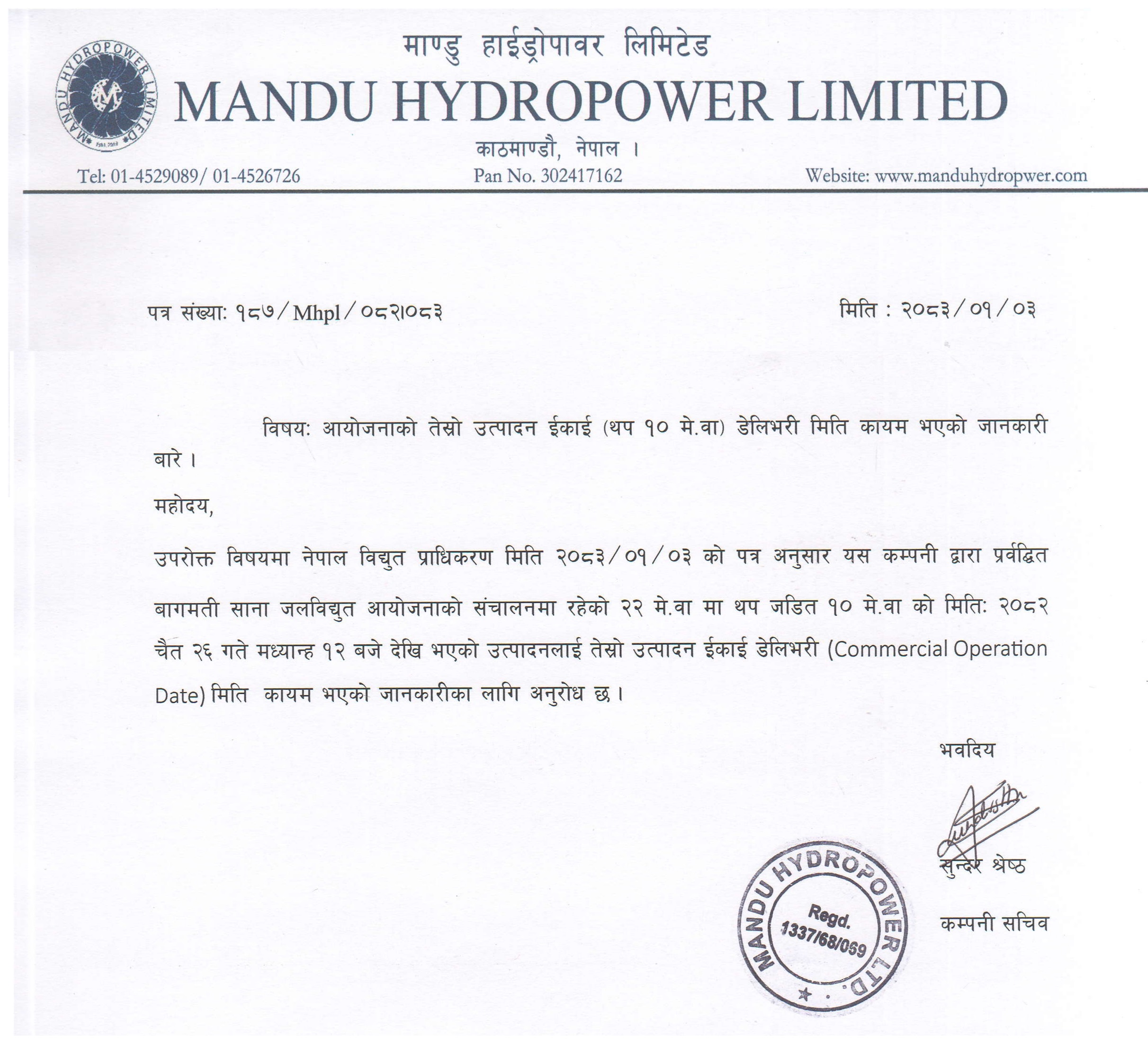 Mandu Hydropower Limited (Mandu) was incorporated in 2006 with an objective of hydroelectricity generation through optimal utilization of Bagmati River and other resources within the country. Nepalese promoters holds majority ownership with 51% including 10% equity ownership of affected area shareholding. Remaining 49% shareholding is from Chinese Investor.
